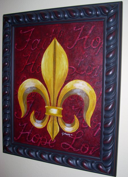 I began painting Fleur-de-lis painting in late 2007. I knew their was a market for the paintings. I was proud on the original fleur-de-lis design, but I only painted simple backgrounds at first. In mid 2008 I tried to work the words “Faith, Hope and Love” into the backgound. These took a lot longer than the older versions, but these are more fulfilling to do as an artist.