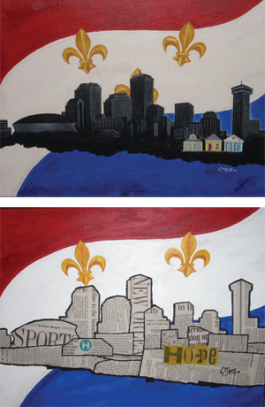 The background is a stylized version of the New Orleans flag. I personally like the newsprint version the best. I mean look at how I hand-selected each piece of newsprint for each specific spot in the painting. Most other people like the top one better. These have generated lot’s of interest, but I haven’t sold one yet.