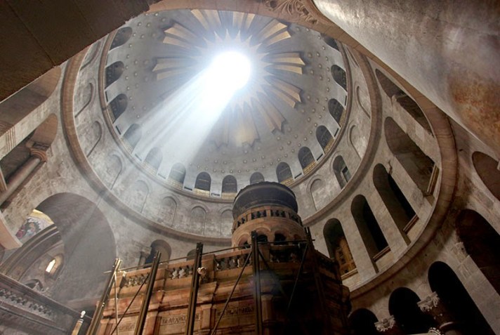 In his writings, Cyril of Jerusalem mentions that some of original rock around the tomb was cut away during construction of the Constantine’s edicule. Cyril also implies that he saw a rock-cut tomb before it was altered and adorned. Later, more of the rock was cut away. The current edicule built in 1809-10, is the fourth structure to cover the tomb. Though completely covered in marble in the Middle Ages, possibly to protect the rock from visitors, the layout of a two-chambered tomb is preserved. The back chamber includes a shelf or bench where Jesus’ body would have been laid.