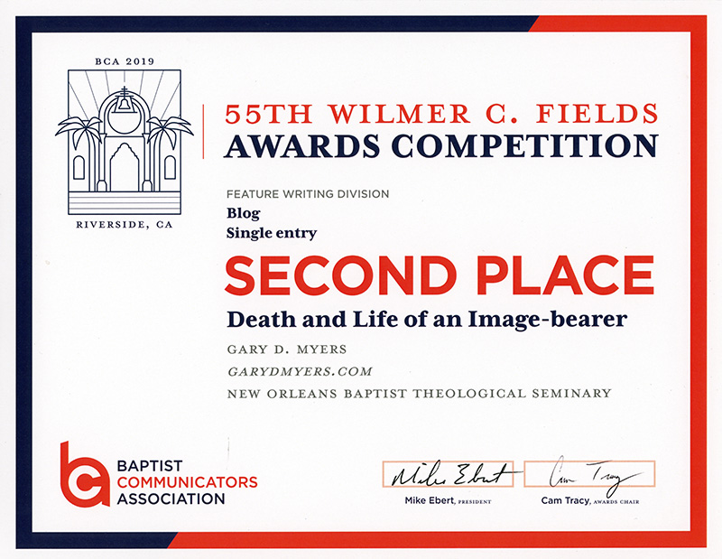Death and Life of an Image-bearer was honored during the 55th Wilmer C. Fields Awards Competition by the Baptist Communicators Association. The post was awarded Second Place in the Feature Writing Division: Blog, Single Entry Category.